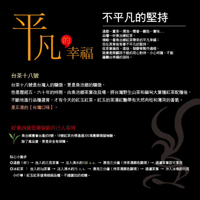> 魚池鄉農會日月潭紅茶 > 魚池鄉農會紅茶系列/茶包 > [南投縣魚池鄉農會-日月潭紅茶館] 魚池農會 台茶十八號(紅玉紅茶)(24茶包入)*1盒台茶 18 號(紅玉 ) 的口感、色澤、香味最為獨特,有別於阿薩姆的天然花果香氣,其茶湯具有天然肉桂香外,尚有淡淡薄荷香,是世界知名紅茶中極為獨特之品種,堪稱「世界頂級』